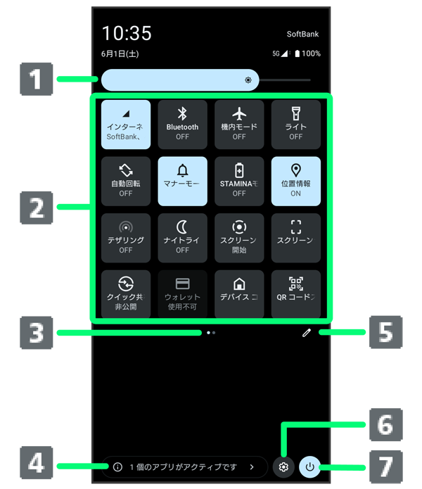 クイック設定ツールの表示位置を示します。クイック設定ツールを左右にフリックすると表示位置を切り替えられます。 - 実行中のアプリ1