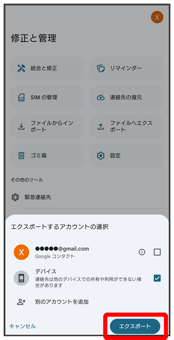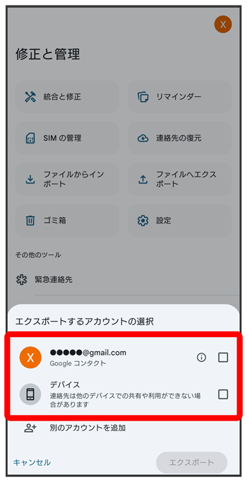 エクスポートする連絡先の保存先をタップ