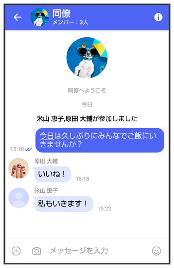 同じグループのメンバーに写真やスタンプなどが共有できます。