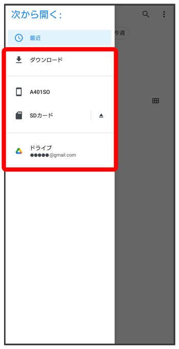 - SDカードはSDカードを挿入している場合、Google ドライブはGoogle アカウントを設定している場合に表示されます。