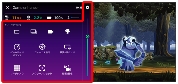 はドラッグしてお好みの位置に配置できます。 - Game enhancer使用中は、がOFFになります。詳しくは、「STAMINAモードを利用する」を参照してください。電池残量を優先する場合は、ゲーム中に