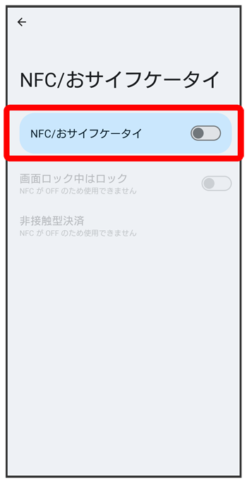 表示)にすると、画面ロック中はNFC/おサイフケータイ®機能がロックされます。画面ロックを解除している間のみ、NFC/おサイフケータイ®機能を利用できます。