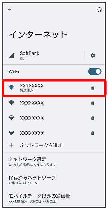 インターネット画面で、接続中のWi-Fi ネットワークをタップ