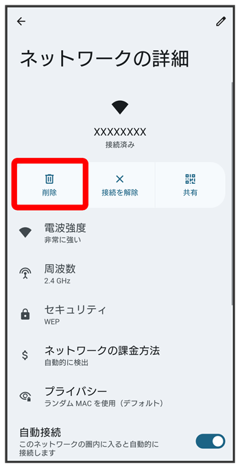 - Wi-Fi ネットワークとの接続を削除すると、再接続のときにパスワードの入力が必要になる場合があります。