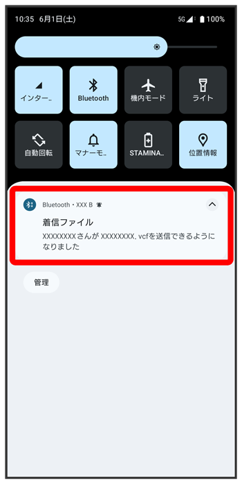 受信完了後、ステータスバーを下にフリックファイル受信の通知をタップ