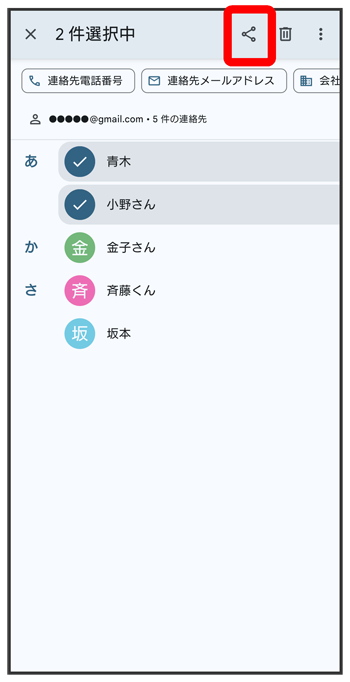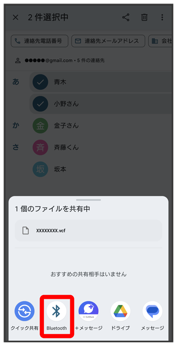 - 複数の連絡先を送信する場合は、対象の連絡先をロングタッチ(