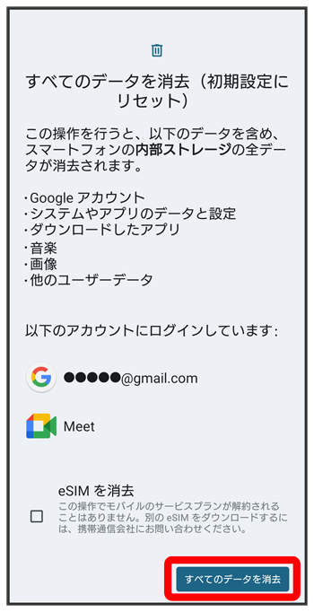 - eSIMを使用しているときは、にチェックを入れて次に進むと、現在利用しているeSIMが消去されますのでご注意ください。