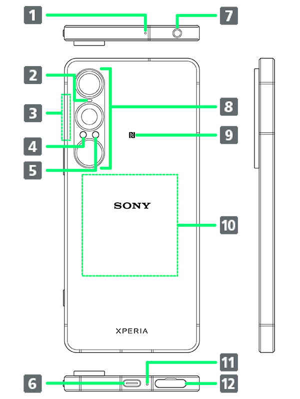 | 5Gアンテナ部 | データ通信を利用する際のアンテナが内蔵されています。 できるだけ手で覆わないようにしてください。通信品質に影響を及ぼす可能性があります。また長時間使用している場合は熱を持つ場合もあります。 |