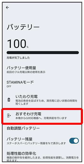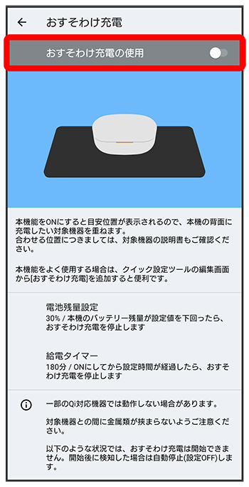 - おすそわけ充電は、Qi対応機器に対応しています。ただし、すべてのQi対応機器との動作を保証するものではありません。