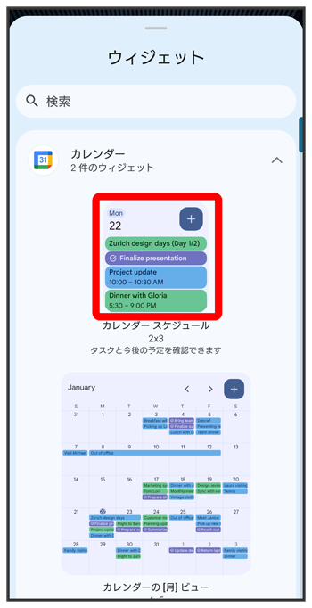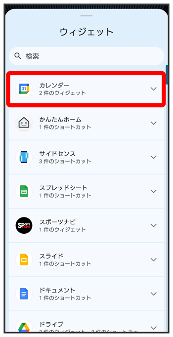 - 画面上部のウィジェット検索バーをタップカテゴリ/ウィジェットの名前を入力と操作すると、カテゴリやウィジェットを検索できます。
