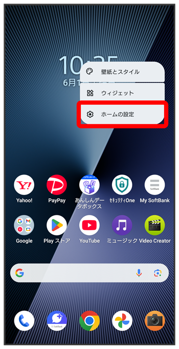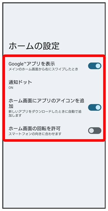 | ホーム画面の回転を許可 | 本機の向きに合わせて、ホーム画面を自動で縦表示/横表示に切り替えるかどうかを設定します。 |