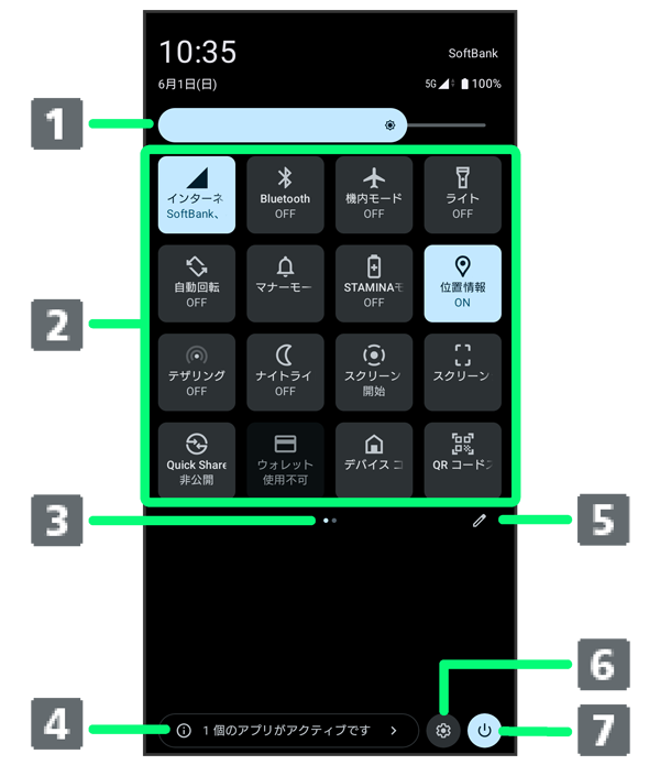 クイック設定ツールの表示位置を示します。クイック設定ツールを左右にフリックすると表示位置を切り替えられます。 - 実行中のアプリ2