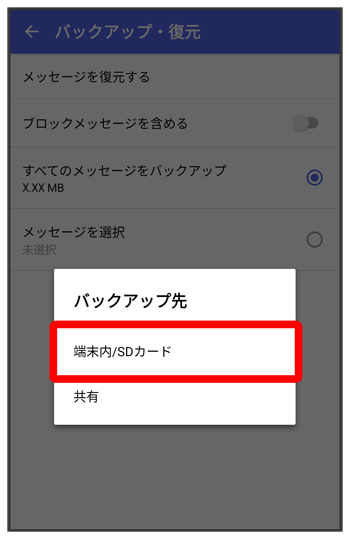 表示)にしてください。 - をタップしたときは、バックアップしたいメッセージを選択(