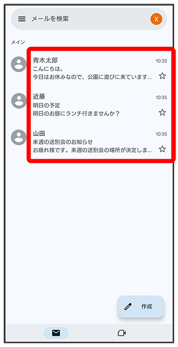 メール一覧画面で未読にするメールをロングタッチメールを削除する