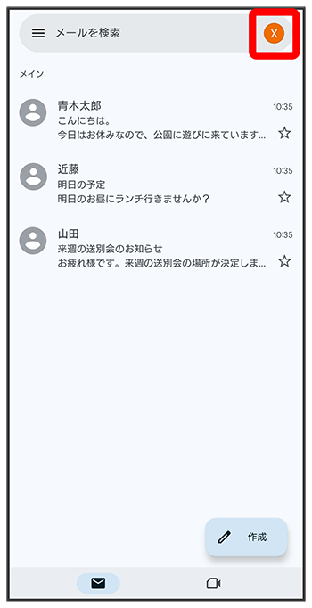 メール一覧画面でアカウントのアイコンをタップ切り替えたいアカウントをタップ