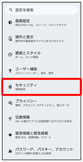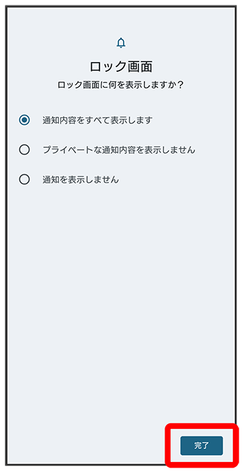 - 画面ロック解除方法を「パターン」/「ロックNo.」/「パスワード」に設定している場合は、画面ロック解除の入力画面が表示されます。画面ロック解除方法を入力し、手順