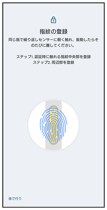 - 指紋全体が登録できるまで、繰り返し指紋センサーに指を当てて離します。