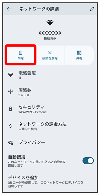 - Wi-Fi ネットワークとの接続を削除すると、再接続のときにパスワードの入力が必要になる場合があります。