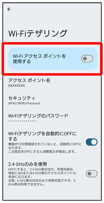 テザリング画面で「アクセス ポイント名」「セキュリティ」「Wi-Fiテザリングのパスワード」などを画面の指示に従って設定
