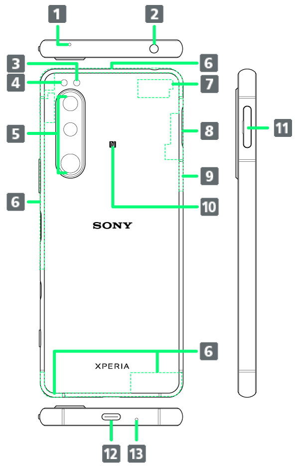 | 5G/4Gアンテナ部/Wi-Fi/GPS/Bluetooth®アンテナ部 | 通話やデータ通信、Wi-Fi、GPS機能、Bluetooth機能を利用する際のアンテナが内蔵されています。 |