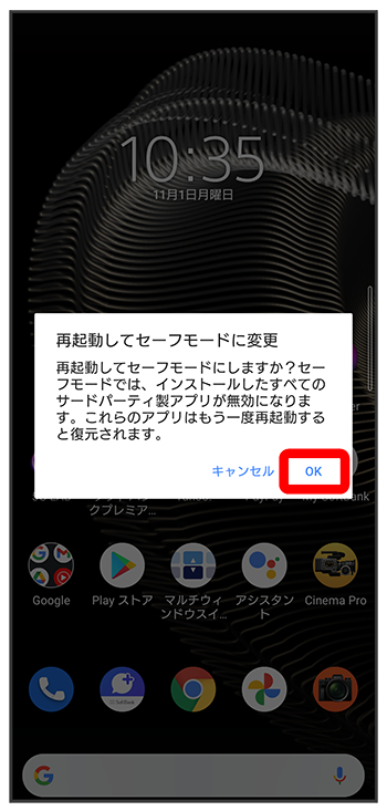 - セーフモードで電源を入れると、画面左下に「セーフモード」と表示されます。