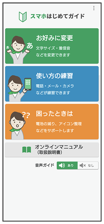 スマホはじめてガイドは、スマホでよく使う機能の練習や、基本的な設定をかんたんに行うことができます。
