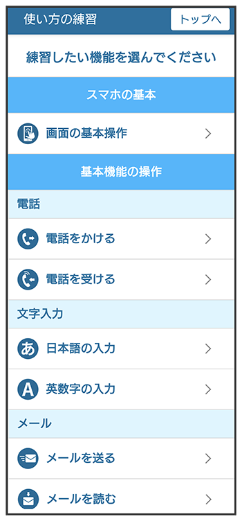 「使い方の練習」では、スマホでよく使う基本的な機能を、実際の画面で練習することができます。
