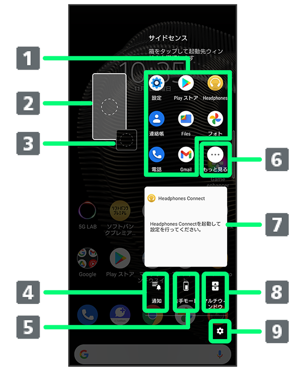 - サイドセンスバーを上にスライド(指でなぞる)と操作してもマルチウィンドウメニューを表示できます。