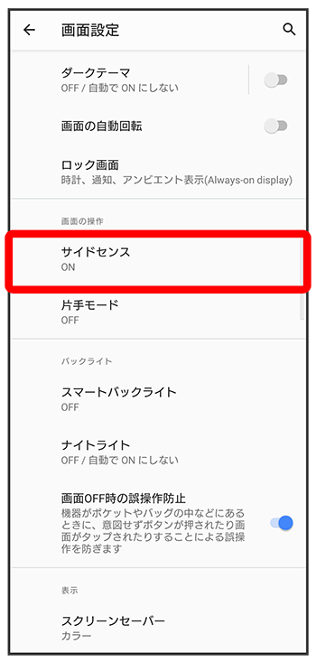 | サイドセンスバーの感度調整 | サイドセンスバーが認識するダブルタップ操作の速度や、スライド操作の長さを調節します。 |