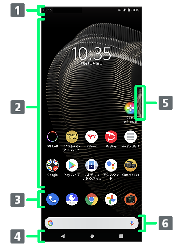 | ステータスバー | 下にフリックすると、通知パネルを表示します。続けて画面を下にフリックすると、クイック設定パネルを表示します。 |