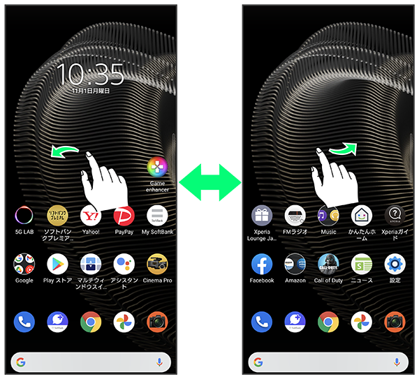 各ホーム画面シートをアプリのショートカットやウィジェットなどでカスタマイズして、便利に使用できます。ホーム画面を左右にフリックすると、ホーム画面シートを切り替えることができます。