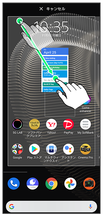 ホーム画面で対象のアイテムをロングタッチ移動したい場所にドラッグウィジェットやアイコンを削除する