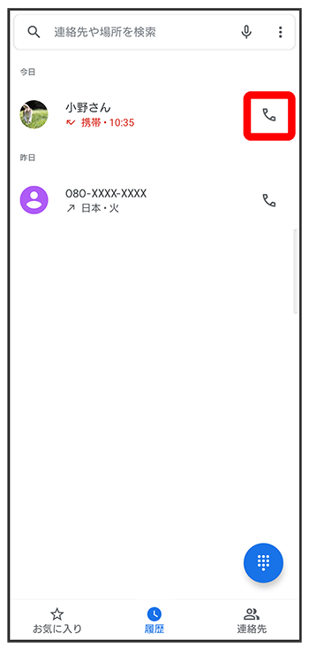 通話履歴画面で対象の通話履歴の名前/電話番号をタップ通話の詳細画面が表示されます。