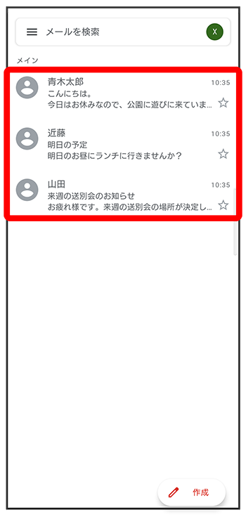 メール一覧画面で未読にするメールをロングタッチメールを削除する