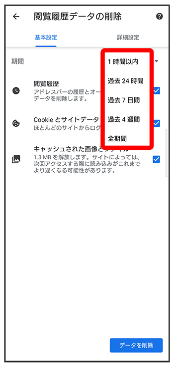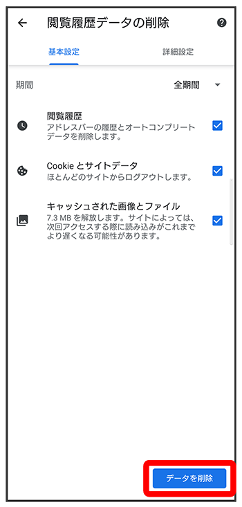 と操作しても閲覧履歴データの削除画面を表示できます。
