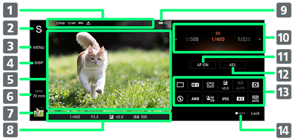 | Lock | 画面左側の項目と設定項目エリアがロックされ、本機を構えたときに誤って設定が変更されないようにすることができます。 |