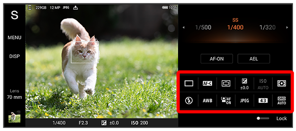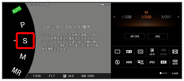 シャッタースピードのダイヤルを左右にドラッグして設定