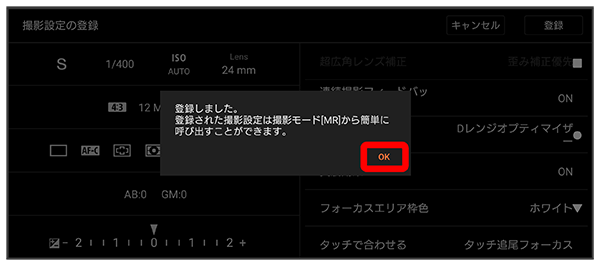 よく使う撮影モードや設定の組み合わせを登録してMRモード(メモリーリコールモード)から呼び出せるように登録できます。