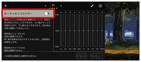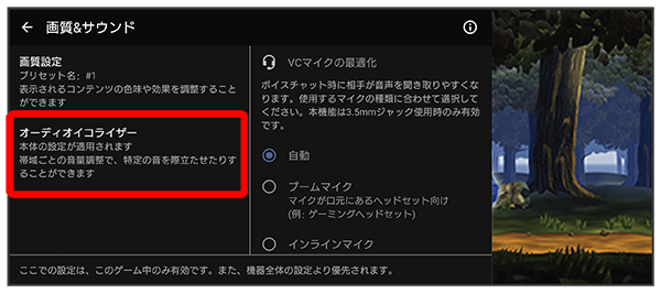 オーディオイコライザーの設定を4つまでプリセットできます。ゲームの状況に応じてプリセットを選択して、音を調整することができます。