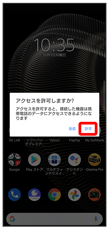 本機とパソコンをUSB Type-Cケーブルで接続すると、アクセス許可の画面が表示されます。