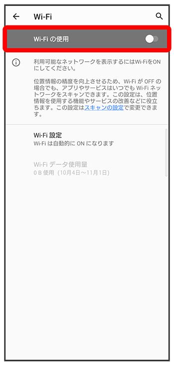 - Wi-Fi ネットワークがスキャンされます。スキャンが終わると、画面に利用できるWi-Fi ネットワークが表示されます。