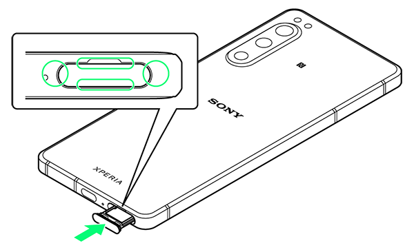 - ○部分をしっかりと押し、本体とSIMカード/SDカード挿入口のカバーにすき間がないことを確認してください。