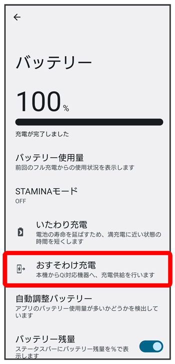 - おすそわけ充電は、Qi対応機器に対応しています。ただし、すべてのQi対応機器との動作を保証するものではありません。
