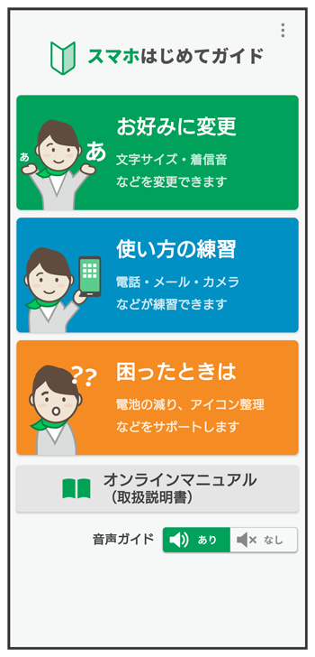 スマホはじめてガイドは、スマホでよく使う機能の練習や、基本的な設定をかんたんに行うことができます。
