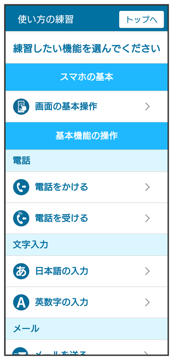 「使い方の練習」では、スマホでよく使う基本的な機能を、実際の画面で練習することができます。