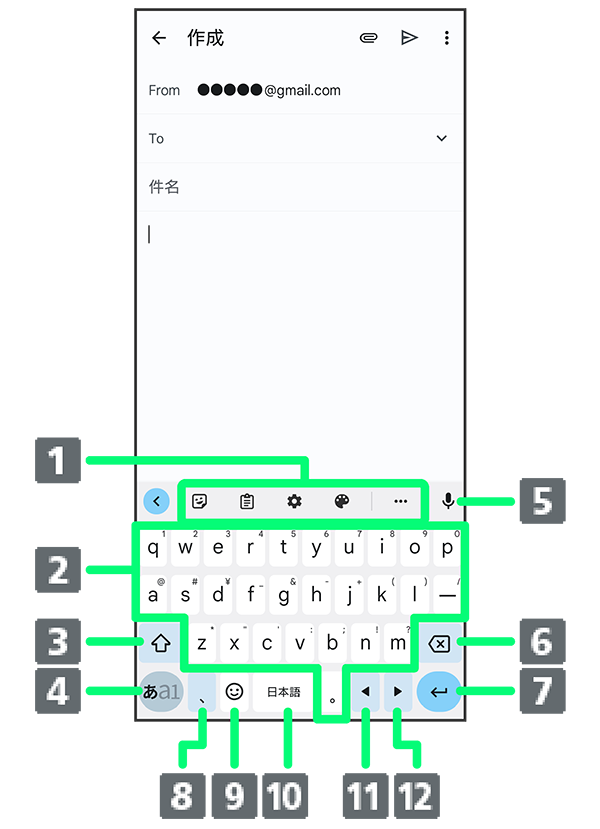 などが表示されます。 - 読点を入力します。ロングタッチすると文字入力の設定画面を表示したり、片手モードを設定したりできます。