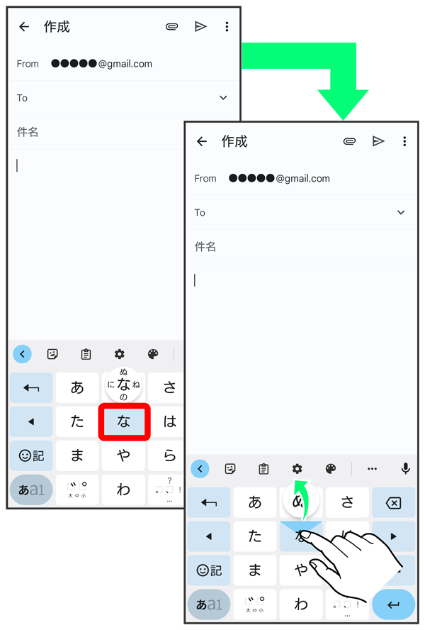 キーを上下左右にフリックすることで、キーを繰り返しタップすることなく、入力したい文字を入力できます。キーに触れると、フリック入力で入力できる候補が表示されます。入力したい文字が表示されている方向にフリックすると、文字が入力されます。