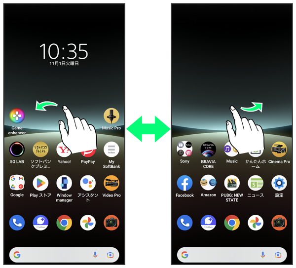 各ホーム画面シートをアプリのショートカットやウィジェットなどでカスタマイズして、便利に使用できます。ホーム画面を左右にフリックすると、ホーム画面シートを切り替えることができます。