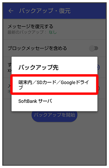 メッセージデータを端末内/SDカード/Google ドライブにバックアップする