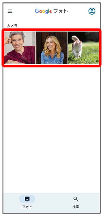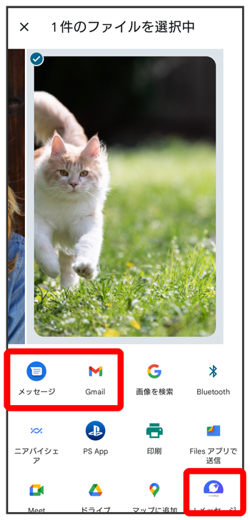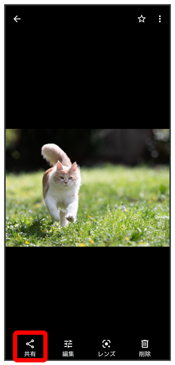写真/動画一覧画面で写真/動画をタップ画面の指示に従って操作- Google アカウントでログインしている場合は、をタップすると共有できるすべてのアプリを表示させることができます。